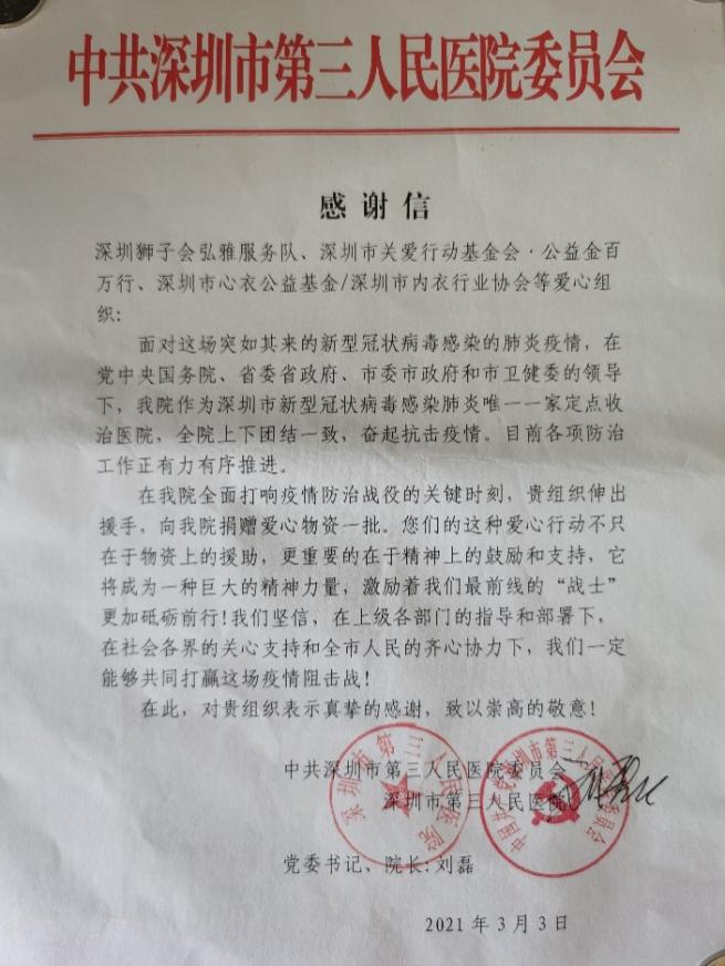 深圳市第三人民医院是深圳市新型冠状病毒感染肺炎唯一定点收治医院,院党委书记、院长刘磊先生代表医院向李丽董事长、向深圳狮子会弘雅服务队及其他社会爱心组织表示诚挚感谢,并送上亲笔签名的感谢信。