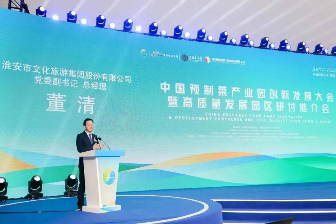 淮安市文化旅游集团股份有限公司党委副书记总经理董清发表致辞,他表示:“欢迎大家来到‘世界美食之都’淮安,“淮安是‘中国淮扬菜之乡','中国食品名城’,淮安发展预制菜产业,基础优势得天独厚。一是深厚的美食文化底蕴;二是坚实的食品产业基础;三是优良的绿色生态环境;四是浓厚的联合创新氛围。支持把握产业路径;支持制定产品标准;支持科研攻关,出精品、出爆款;支持解决技术难点、痛点;支持构建人才梯队,支持塑造产业文化,打造淮安样板模式。中国预制菜产业园创新发展工程与淮安市文旅集团、淮安预制菜企业将联合创新,构建常规化、规范化指导支持的机制、平台,支持把淮扬菜师傅的好手艺,变成预制菜的精工艺,打造舌尖上的美味和舌尖上的健康。